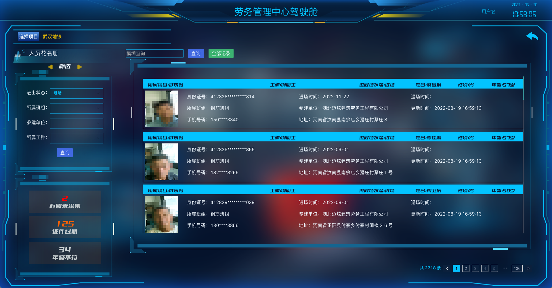 企業(yè)級項目信息集中管控。收錄各項目人員信息及考勤信息,對考勤率進行項目排名,對各項目超齡、證件失效等人員進行危險預(yù)警。
