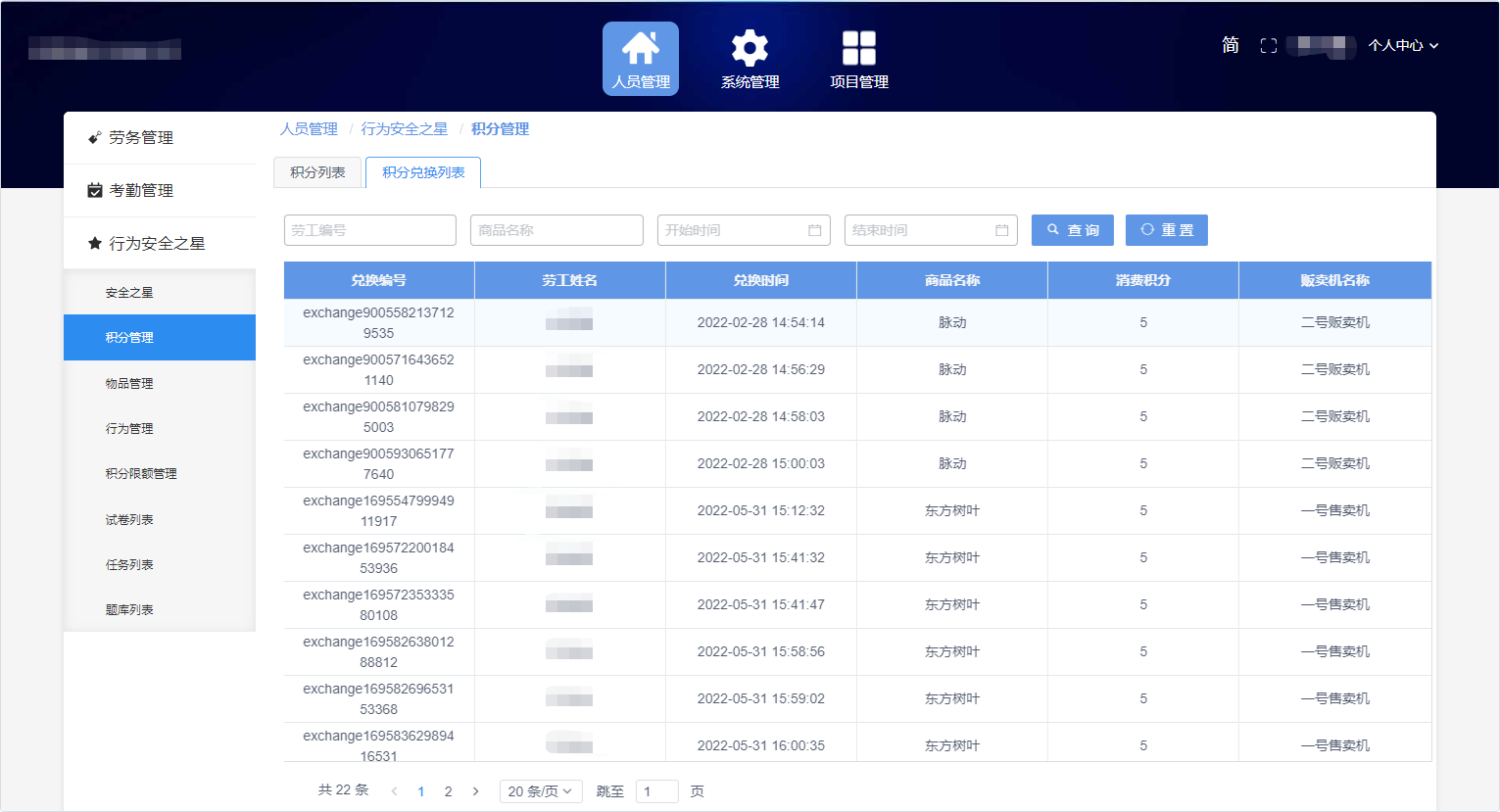 查看勞工當(dāng)前積分余額以及勞工積分兌換情況,對員工積分使用明細(xì)進(jìn)行記錄,包括兌換時(shí)間、兌換物品以及兌換地點(diǎn)。