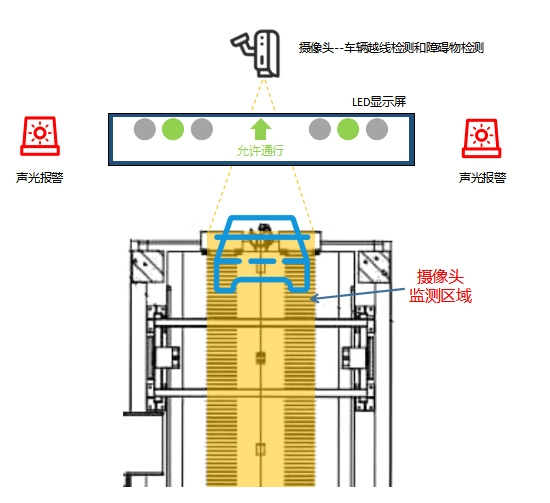 為解決火車(chē)輸送廂與裝卸平臺(tái)間汽車(chē)轉(zhuǎn)運(yùn)偏差問(wèn)題,建立場(chǎng)站車(chē)輛安全行為管理系統(tǒng),通過(guò)視覺(jué)算法識(shí)別車(chē)輛是否正確行駛在規(guī)定位置上,有效預(yù)防安全事故發(fā)生以及財(cái)產(chǎn)損壞。結(jié)合視覺(jué)算法、車(chē)輛信號(hào)引導(dǎo)LED屏幕以及聲光報(bào)警系統(tǒng)進(jìn)行駕駛輔助提示。