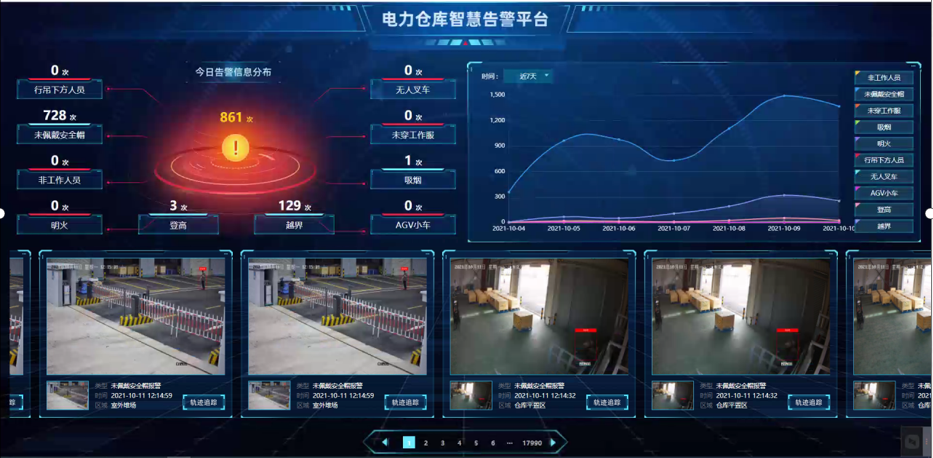統(tǒng)計(jì)各類(lèi)告警信息,展現(xiàn)各類(lèi)告警的趨勢(shì),協(xié)助倉(cāng)庫(kù)管理員優(yōu)化倉(cāng)庫(kù)管理配置;通過(guò)即時(shí)通訊,前端及時(shí)收取算法分析倉(cāng)庫(kù)實(shí)景得出的告警或預(yù)警結(jié)果,告警支持視頻以及圖片的形式,有助于管理員對(duì)于危險(xiǎn)情形的定位與溯源。